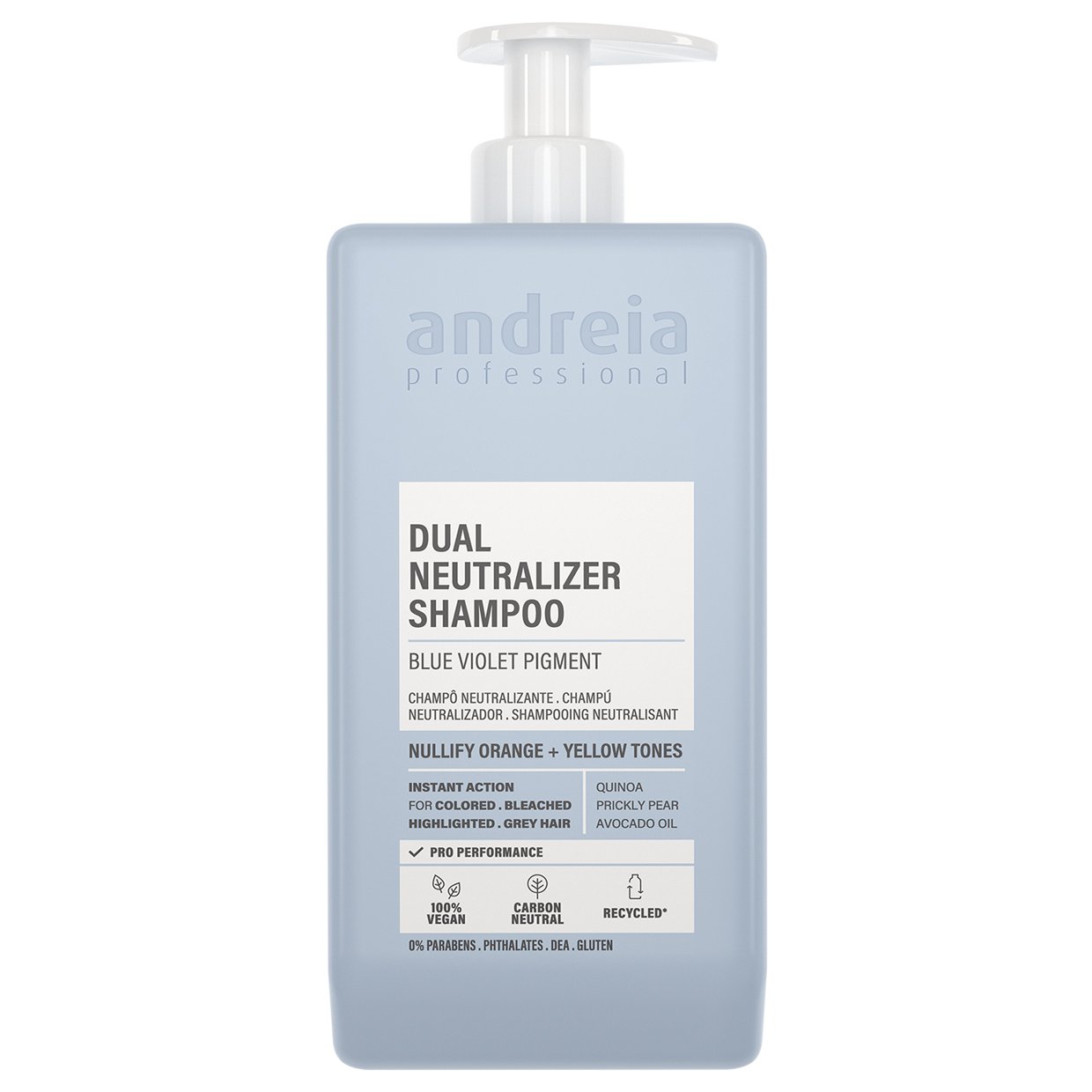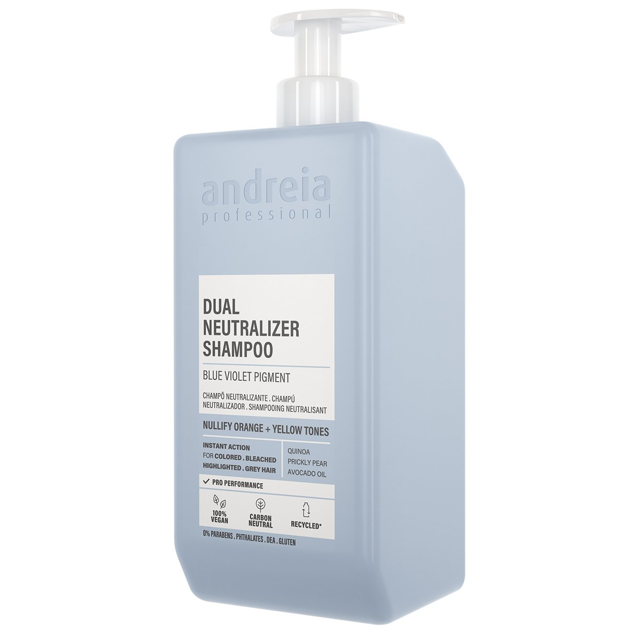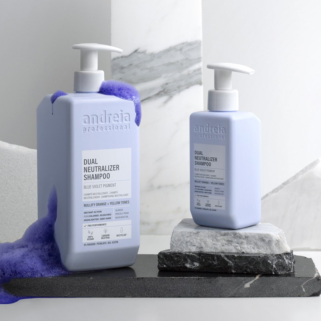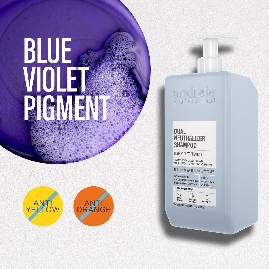 Andreia Professional Dual Neutralizer Shampoo means TWO actions in ONE bottle! The Neutralizing Shampoo combines blue and violet pigments, which SIMULTANEOUSLY NEUTRALIZE Orange + Yellow Tones!