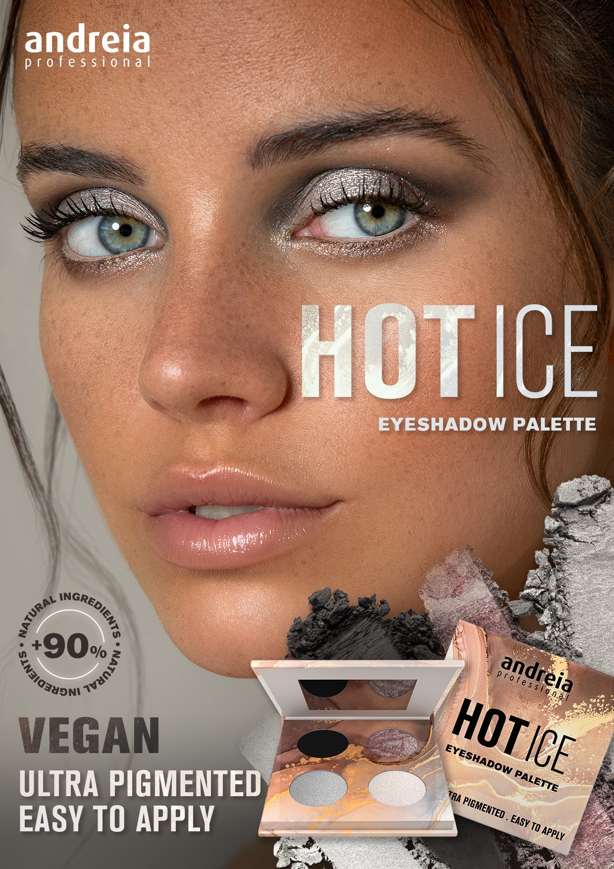 The HOT ICE ultra-pigmented eyeshadow palette features a range of finishes, including matte, shimmer, and glitter shades, that can be used separately or blended to create a bolder, more contrasting look.